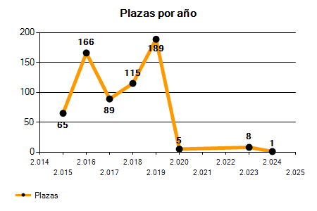 En los siguientes gráficos se puede ver la evolución del número de convocatorias y plazas convocadas para la profesión de Administradores Gestión Financiera de los últimos años pudiéndose observar una caída del 100,00% desde el año 2015 hasta el 2025 en número de convocatorias y una caída del 100,00% en número de plazas convocadas.