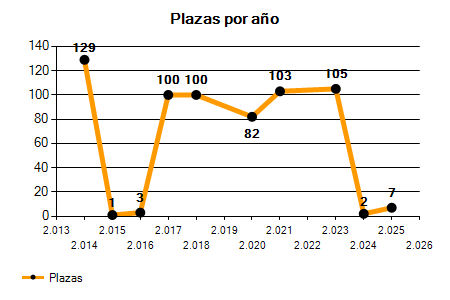 En los siguientes gráficos se puede ver la evolución del número de convocatorias y plazas convocadas para la profesión de Agente Rural de los últimos años pudiéndose observar un crecimiento y una caída del 0,00% desde el año 2014 hasta el 2025 en número de convocatorias y una caída del 94,57% en número de plazas convocadas.