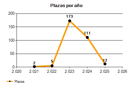 En los siguientes gráficos se puede ver la evolución del número de convocatorias y plazas convocadas para la profesión de Animador Sociocultural de los últimos años pudiéndose observar un crecimiento del 400,00% desde el año 2021 hasta el 2025 en número de convocatorias y un crecimiento del 500,00% en número de plazas convocadas.