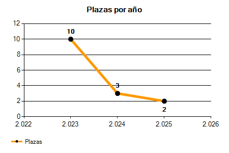 En los siguientes gráficos se puede ver la evolución del número de convocatorias y plazas convocadas para la profesión de Asesor Técnico de los últimos años pudiéndose observar una caída del 83,33% desde el año 2023 hasta el 2025 en número de convocatorias y una caída del 80,00% en número de plazas convocadas.