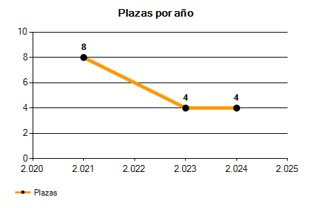 En los siguientes gráficos se puede ver la evolución del número de convocatorias y plazas convocadas para la profesión de Auxiliar Administrativo Contable de los últimos años pudiéndose observar una caída del 100,00% desde el año 2021 hasta el 2025 en número de convocatorias y una caída del 100,00% en número de plazas convocadas.