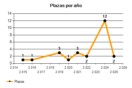 En los siguientes gráficos se puede ver la evolución del número de convocatorias y plazas convocadas para la profesión de Auxiliar Administrativo Intervención de los últimos años pudiéndose observar un crecimiento del 100,00% desde el año 2015 hasta el 2025 en número de convocatorias y un crecimiento del 100,00% en número de plazas convocadas.