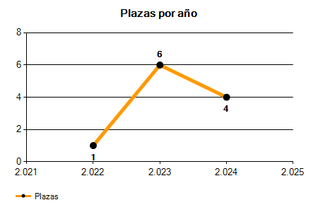 En los siguientes gráficos se puede ver la evolución del número de convocatorias y plazas convocadas para la profesión de Auxiliar Administrativo Juzgado de Paz de los últimos años pudiéndose observar una caída del 100,00% desde el año 2022 hasta el 2025 en número de convocatorias y una caída del 100,00% en número de plazas convocadas.