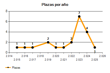 En los siguientes gráficos se puede ver la evolución del número de convocatorias y plazas convocadas para la profesión de Auxiliar Administrativo Tesorería de los últimos años pudiéndose observar un crecimiento y una caída del 0,00% desde el año 2015 hasta el 2025 en número de convocatorias y un crecimiento y una caída del 0,00% en número de plazas convocadas.