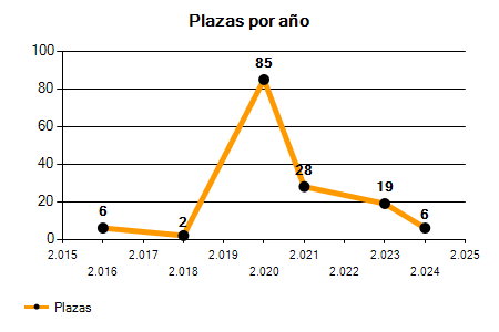 En los siguientes gráficos se puede ver la evolución del número de convocatorias y plazas convocadas para la profesión de Auxiliar de Control de Residuos de los últimos años pudiéndose observar una caída del 100,00% desde el año 2016 hasta el 2025 en número de convocatorias y una caída del 100,00% en número de plazas convocadas.