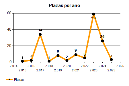 En los siguientes gráficos se puede ver la evolución del número de convocatorias y plazas convocadas para la profesión de Auxiliar de Cultura de los últimos años pudiéndose observar un crecimiento del 200,00% desde el año 2015 hasta el 2025 en número de convocatorias y un crecimiento del 200,00% en número de plazas convocadas.