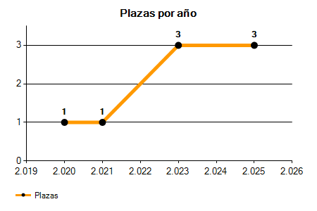 En los siguientes gráficos se puede ver la evolución del número de convocatorias y plazas convocadas para la profesión de Auxiliar de Empleo y Desarrollo Local de los últimos años pudiéndose observar un crecimiento del 200,00% desde el año 2020 hasta el 2025 en número de convocatorias y un crecimiento del 200,00% en número de plazas convocadas.