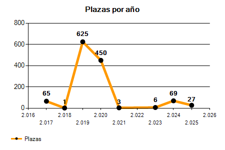 En los siguientes gráficos se puede ver la evolución del número de convocatorias y plazas convocadas para la profesión de Auxiliar de Gestión de los últimos años pudiéndose observar un crecimiento del 1.400,00% desde el año 2017 hasta el 2025 en número de convocatorias y una caída del 58,46% en número de plazas convocadas.