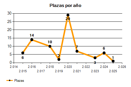 En los siguientes gráficos se puede ver la evolución del número de convocatorias y plazas convocadas para la profesión de Auxiliar de Gestión, Inspección y Recaudación Tributaria Local de los últimos años pudiéndose observar un crecimiento y una caída del 0,00% desde el año 2015 hasta el 2025 en número de convocatorias y una caída del 83,33% en número de plazas convocadas.