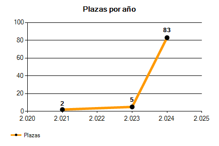 En los siguientes gráficos se puede ver la evolución del número de convocatorias y plazas convocadas para la profesión de Auxiliar de Instalaciones y Edificios Municipales de los últimos años pudiéndose observar una caída del 100,00% desde el año 2021 hasta el 2025 en número de convocatorias y una caída del 100,00% en número de plazas convocadas.