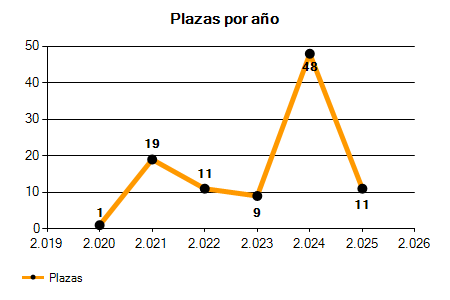 En los siguientes gráficos se puede ver la evolución del número de convocatorias y plazas convocadas para la profesión de Auxiliar de Vías y Obras de los últimos años pudiéndose observar un crecimiento del 800,00% desde el año 2020 hasta el 2025 en número de convocatorias y un crecimiento del 1.000,00% en número de plazas convocadas.