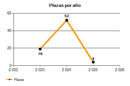 En los siguientes gráficos se puede ver la evolución del número de convocatorias y plazas convocadas para la profesión de Auxiliar de Vivienda Tutelada de los últimos años pudiéndose observar una caída del 83,33% desde el año 2023 hasta el 2025 en número de convocatorias y una caída del 78,95% en número de plazas convocadas.