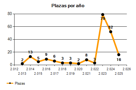En los siguientes gráficos se puede ver la evolución del número de convocatorias y plazas convocadas para la profesión de Auxiliar notificador de los últimos años pudiéndose observar un crecimiento del 100,00% desde el año 2013 hasta el 2025 en número de convocatorias y un crecimiento del 700,00% en número de plazas convocadas.