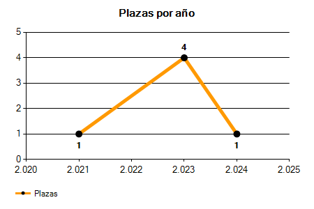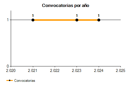 En los siguientes gráficos se puede ver la evolución del número de convocatorias y plazas convocadas para la profesión de Auxiliar Técnico/a de Territorio de los últimos años pudiéndose observar una caída del 100,00% desde el año 2021 hasta el 2025 en número de convocatorias y una caída del 100,00% en número de plazas convocadas.
