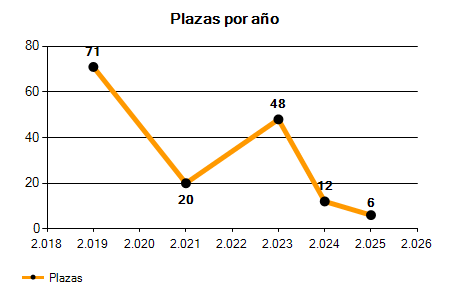 En los siguientes gráficos se puede ver la evolución del número de convocatorias y plazas convocadas para la profesión de Auxiliares Técnicos de Medio Ambiente de los últimos años pudiéndose observar un crecimiento del 300,00% desde el año 2019 hasta el 2025 en número de convocatorias y una caída del 91,55% en número de plazas convocadas.