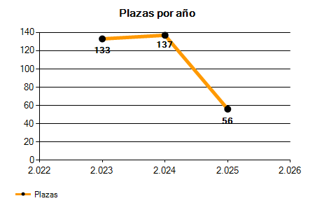 En los siguientes gráficos se puede ver la evolución del número de convocatorias y plazas convocadas para la profesión de Ayudante de los últimos años pudiéndose observar una caída del 47,06% desde el año 2023 hasta el 2025 en número de convocatorias y una caída del 57,89% en número de plazas convocadas.
