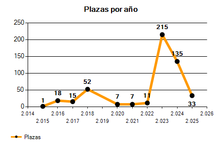 En los siguientes gráficos se puede ver la evolución del número de convocatorias y plazas convocadas para la profesión de Ayudante de Biblioteca de los últimos años pudiéndose observar un crecimiento del 1.200,00% desde el año 2015 hasta el 2025 en número de convocatorias y un crecimiento del 3.200,00% en número de plazas convocadas.
