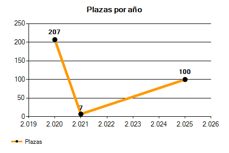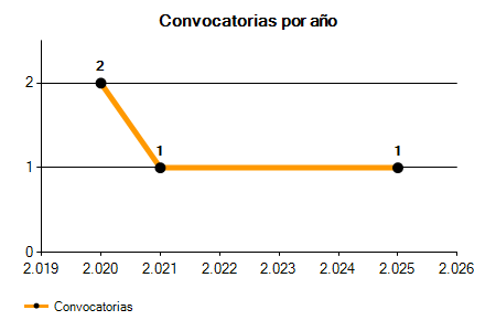 En los siguientes gráficos se puede ver la evolución del número de convocatorias y plazas convocadas para la profesión de Ayudante de Residencia/Servicios de los últimos años pudiéndose observar una caída del 50,00% desde el año 2020 hasta el 2025 en número de convocatorias y una caída del 51,69% en número de plazas convocadas.