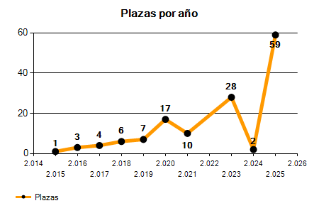 En los siguientes gráficos se puede ver la evolución del número de convocatorias y plazas convocadas para la profesión de Brigada de obras de los últimos años pudiéndose observar un crecimiento del 1.200,00% desde el año 2015 hasta el 2025 en número de convocatorias y un crecimiento del 5.800,00% en número de plazas convocadas.