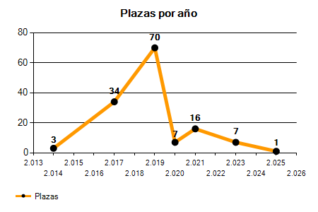 En los siguientes gráficos se puede ver la evolución del número de convocatorias y plazas convocadas para la profesión de Camarero de los últimos años pudiéndose observar un crecimiento y una caída del 0,00% desde el año 2014 hasta el 2025 en número de convocatorias y una caída del 66,67% en número de plazas convocadas.