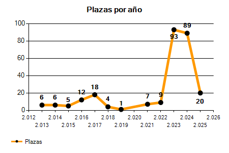 En los siguientes gráficos se puede ver la evolución del número de convocatorias y plazas convocadas para la profesión de Capataz de los últimos años pudiéndose observar un crecimiento del 83,33% desde el año 2013 hasta el 2025 en número de convocatorias y un crecimiento del 216,67% en número de plazas convocadas.