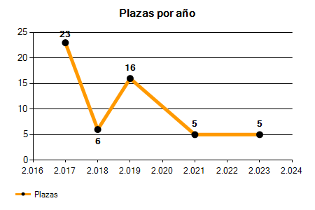 En los siguientes gráficos se puede ver la evolución del número de convocatorias y plazas convocadas para la profesión de Ciencias Sociales y del Trabajo de los últimos años pudiéndose observar una caída del 100,00% desde el año 2017 hasta el 2025 en número de convocatorias y una caída del 100,00% en número de plazas convocadas.