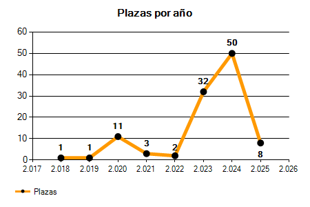 En los siguientes gráficos se puede ver la evolución del número de convocatorias y plazas convocadas para la profesión de Conductor de Residuos de los últimos años pudiéndose observar un crecimiento del 400,00% desde el año 2018 hasta el 2025 en número de convocatorias y un crecimiento del 700,00% en número de plazas convocadas.