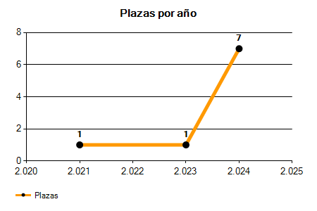 En los siguientes gráficos se puede ver la evolución del número de convocatorias y plazas convocadas para la profesión de Coordinador/a Informático de los últimos años pudiéndose observar una caída del 100,00% desde el año 2021 hasta el 2025 en número de convocatorias y una caída del 100,00% en número de plazas convocadas.