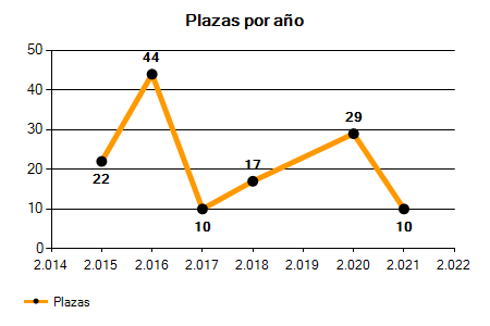 En los siguientes gráficos se puede ver la evolución del número de convocatorias y plazas convocadas para la profesión de Cuerpo Superior de Gestión Catastral de los últimos años pudiéndose observar una caída del 100,00% desde el año 2024 hasta el 2025 en número de convocatorias y una caída del 100,00% en número de plazas convocadas.
