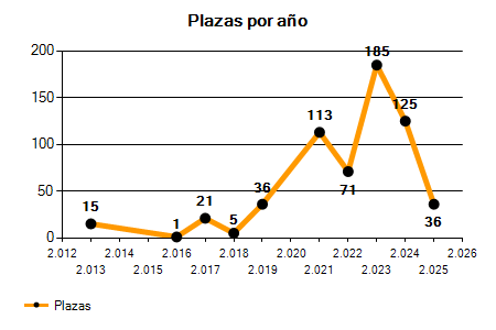 En los siguientes gráficos se puede ver la evolución del número de convocatorias y plazas convocadas para la profesión de Cuidador de los últimos años pudiéndose observar una caída del 20,00% desde el año 2013 hasta el 2025 en número de convocatorias y un crecimiento del 140,00% en número de plazas convocadas.