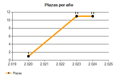 En los siguientes gráficos se puede ver la evolución del número de convocatorias y plazas convocadas para la profesión de Dinamizador de Nuevas Tecnologías de los últimos años pudiéndose observar una caída del 100,00% desde el año 2020 hasta el 2025 en número de convocatorias y una caída del 100,00% en número de plazas convocadas.