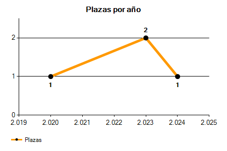 En los siguientes gráficos se puede ver la evolución del número de convocatorias y plazas convocadas para la profesión de Diseñador/a Infografísta de los últimos años pudiéndose observar una caída del 100,00% desde el año 2020 hasta el 2025 en número de convocatorias y una caída del 100,00% en número de plazas convocadas.
