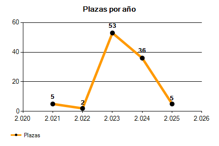 En los siguientes gráficos se puede ver la evolución del número de convocatorias y plazas convocadas para la profesión de Educador de Familia de los últimos años pudiéndose observar un crecimiento del 33,33% desde el año 2021 hasta el 2025 en número de convocatorias y un crecimiento y una caída del 0,00% en número de plazas convocadas.