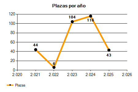 En los siguientes gráficos se puede ver la evolución del número de convocatorias y plazas convocadas para la profesión de Encargado de Mantenimiento y Obras de los últimos años pudiéndose observar un crecimiento del 72,22% desde el año 2021 hasta el 2025 en número de convocatorias y una caída del 2,27% en número de plazas convocadas.
