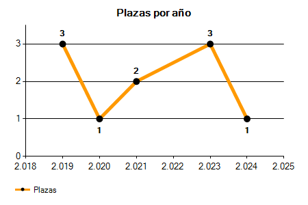 En los siguientes gráficos se puede ver la evolución del número de convocatorias y plazas convocadas para la profesión de Encargado del Servicio de Aguas de los últimos años pudiéndose observar una caída del 100,00% desde el año 2019 hasta el 2025 en número de convocatorias y una caída del 100,00% en número de plazas convocadas.