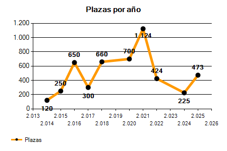 En los siguientes gráficos se puede ver la evolución del número de convocatorias y plazas convocadas para la profesión de Ertzaina de los últimos años pudiéndose observar un crecimiento del 100,00% desde el año 2014 hasta el 2025 en número de convocatorias y un crecimiento del 294,17% en número de plazas convocadas.
