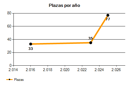 En los siguientes gráficos se puede ver la evolución del número de convocatorias y plazas convocadas para la profesión de Facultativos de Archivos, Bibliotecas y Museos de los últimos años pudiéndose observar un crecimiento del 300,00% desde el año 2015 hasta el 2025 en número de convocatorias y un crecimiento del 314,29% en número de plazas convocadas.