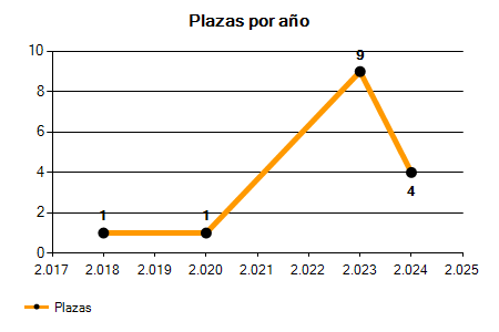 En los siguientes gráficos se puede ver la evolución del número de convocatorias y plazas convocadas para la profesión de Ganadero de los últimos años pudiéndose observar una caída del 100,00% desde el año 2018 hasta el 2025 en número de convocatorias y una caída del 100,00% en número de plazas convocadas.