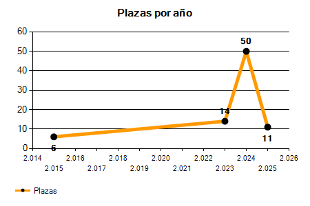 En los siguientes gráficos se puede ver la evolución del número de convocatorias y plazas convocadas para la profesión de Gestión Universitaria de los últimos años pudiéndose observar un crecimiento del 100,00% desde el año 2015 hasta el 2025 en número de convocatorias y un crecimiento del 83,33% en número de plazas convocadas.
