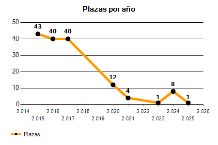 En los siguientes gráficos se puede ver la evolución del número de convocatorias y plazas convocadas para la profesión de Gestor tributario de los últimos años pudiéndose observar una caída del 50,00% desde el año 2015 hasta el 2025 en número de convocatorias y una caída del 97,67% en número de plazas convocadas.