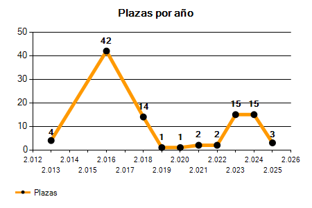 En los siguientes gráficos se puede ver la evolución del número de convocatorias y plazas convocadas para la profesión de Guarda forestal de los últimos años pudiéndose observar un crecimiento y una caída del 0,00% desde el año 2013 hasta el 2025 en número de convocatorias y una caída del 25,00% en número de plazas convocadas.