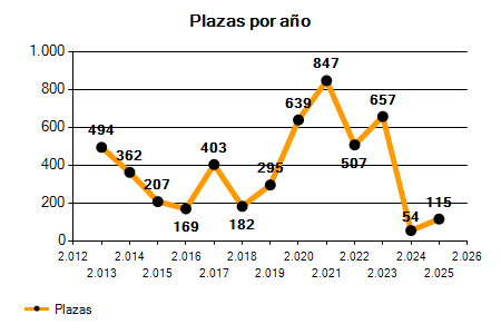 En los siguientes gráficos se puede ver la evolución del número de convocatorias y plazas convocadas para la profesión de Guardia urbana de los últimos años pudiéndose observar una caída del 6,67% desde el año 2013 hasta el 2025 en número de convocatorias y una caída del 76,72% en número de plazas convocadas.