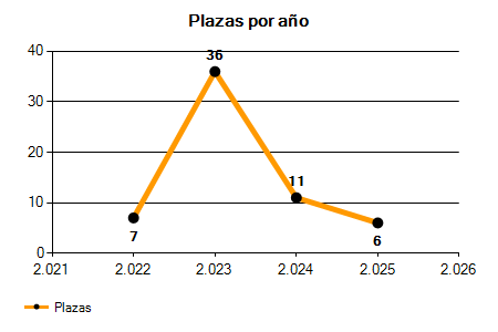 En los siguientes gráficos se puede ver la evolución del número de convocatorias y plazas convocadas para la profesión de Informador Tramitador de los últimos años pudiéndose observar un crecimiento del 200,00% desde el año 2022 hasta el 2025 en número de convocatorias y una caída del 14,29% en número de plazas convocadas.