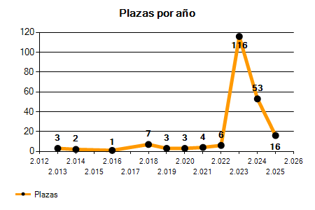 En los siguientes gráficos se puede ver la evolución del número de convocatorias y plazas convocadas para la profesión de Informador Turístico de los últimos años pudiéndose observar un crecimiento del 125,00% desde el año 2013 hasta el 2025 en número de convocatorias y un crecimiento del 433,33% en número de plazas convocadas.