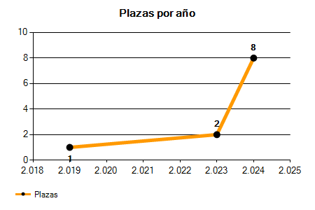 En los siguientes gráficos se puede ver la evolución del número de convocatorias y plazas convocadas para la profesión de Instructor Deportivo de los últimos años pudiéndose observar una caída del 100,00% desde el año 2019 hasta el 2025 en número de convocatorias y una caída del 100,00% en número de plazas convocadas.
