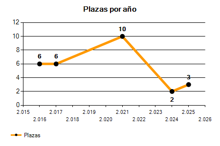 En los siguientes gráficos se puede ver la evolución del número de convocatorias y plazas convocadas para la profesión de Interpretación de la Lengua de Signos de los últimos años pudiéndose observar un crecimiento y una caída del 0,00% desde el año 2016 hasta el 2025 en número de convocatorias y una caída del 50,00% en número de plazas convocadas.