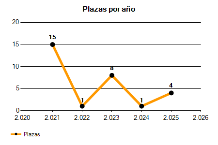 En los siguientes gráficos se puede ver la evolución del número de convocatorias y plazas convocadas para la profesión de Jefa/e de Servicio de Parques, Jardines e Infraestructuras Verdes de los últimos años pudiéndose observar una caída del 33,33% desde el año 2021 hasta el 2025 en número de convocatorias y una caída del 73,33% en número de plazas convocadas.