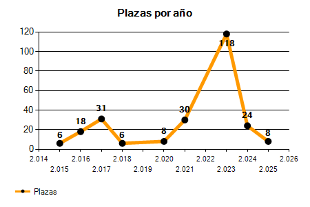 En los siguientes gráficos se puede ver la evolución del número de convocatorias y plazas convocadas para la profesión de Jefe de Sección de los últimos años pudiéndose observar un crecimiento del 60,00% desde el año 2015 hasta el 2025 en número de convocatorias y un crecimiento del 33,33% en número de plazas convocadas.