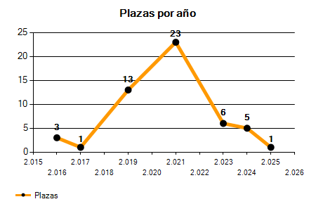 En los siguientes gráficos se puede ver la evolución del número de convocatorias y plazas convocadas para la profesión de Licenciado en Historia de los últimos años pudiéndose observar una caída del 50,00% desde el año 2016 hasta el 2025 en número de convocatorias y una caída del 66,67% en número de plazas convocadas.