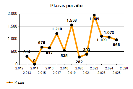 En los siguientes gráficos se puede ver la evolución del número de convocatorias y plazas convocadas para la profesión de Maestro de Pedagogia Terapeutica de los últimos años pudiéndose observar una caída del 23,08% desde el año 2013 hasta el 2025 en número de convocatorias y un crecimiento del 207,64% en número de plazas convocadas.